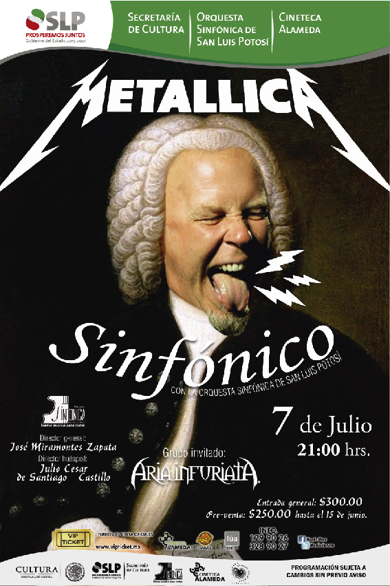 La banda de Heavy Metal con tintes de Rock Progresivo Aria Infuriatta junto con la Orquesta Sinfónica de San Luis Potosí serán las encargadas de interpretar parte del repertorio más conocido de Metallica durante esta velada, que es parte de la promoción cultural encabezada por el gobernador del Estado, Juan Manuel Carreras López.