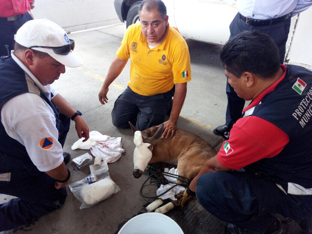 Personal de Protección Civil Municipal se presentó en el sitio para llevar a cabo la captura de este ejemplar, a través de redes de control de fauna silvestre, además de atenderlo en el lugar, ya que presentaba serias heridas y lesiones.