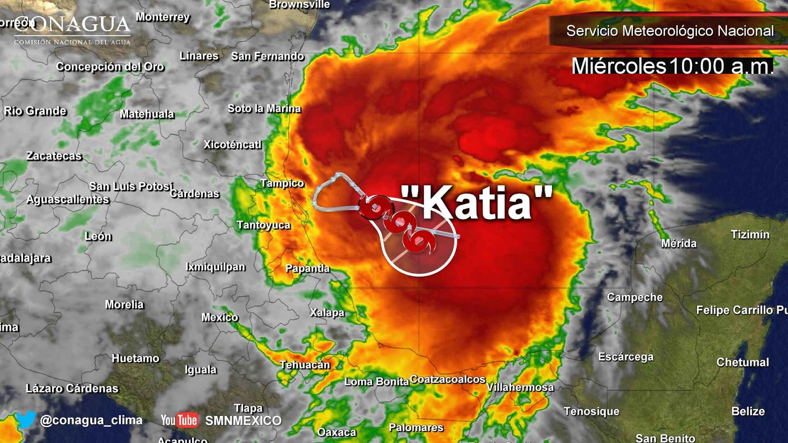 De acuerdo a información del Servicio Meteorológico Nacional a las 07:00 horas, tiempo del centro de México, Katia se localizó aproximadamente a 175 kilómetros (km) al este de Tampico, Tamaulipas, y a 125 km al este-noreste de Cabo Rojo, Veracruz, con vientos máximos sostenidos de 65 km/h, rachas de 85 km/h y desplazamiento al este-sureste a 4 km/h.