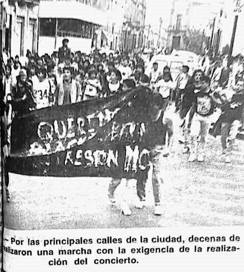 Día del evento 7:00a.m.: creo que ni dormimos, jejejeje, la emoción no era para menos y ya listos y puestos nos dirigimos un grupo de banda en el carro mencionado, cual sería nuestra sorpresa ver la puerta de acceso abierta y ya todo desmontado el escenario, entramos hasta la cancha y pues el saque de onda era general, de pronto llego el cuerpo de policía en 2 camiones listos para arremeter contra la banda, y en un inicio fue confusión horas después fue un verdadero caos.