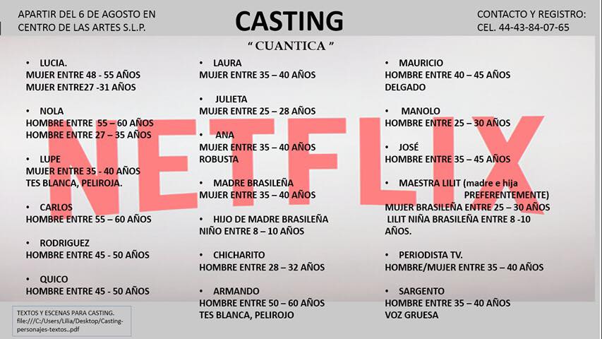 De acuerdo con la información que ha circulado hasta este momento, los papeles que se están ofertando son muchos y muy variados pues van para hombre y mujeres desde los 25 hasta los 55 años, sin embargo, las características que se están solicitando parecieran no coincidir con el potosino prototípico pues, en algunos casos, se piden personas de tez blanca, pelirojos o con rasgos brasiñelos.