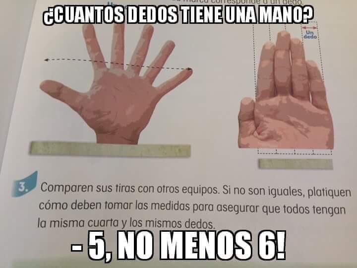 La imagen que circula explica que en la página 161 del libro de Matemáticas de segundo grado se intenta enseñar sobre diferentes tipos de medida, las cuales podrían calcularse con las mismas partes del cuerpo, en ese sentido, sostienen que una cuarta sería la medida comprendida entre el meñique y el pulgar cuando la mano está extendida, sin embargo, en dicha mano se cuentan seis dedos. Imposible para un humano hacer tal cálculo.
