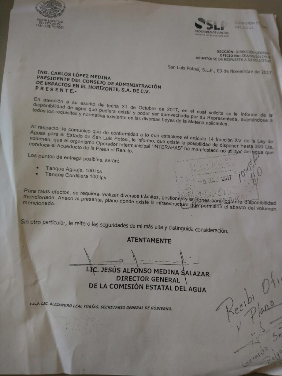 El oficio de la CEA, de la cual este medio tiene copia establece que de acuerdo a la solicitud de fecha 31 de octubre del año 2017 el Ing. Carlos López Medina Presidente del Consejo de Administración de Espacios de Horizontes, empresa que pretende formar la Inmobiliaria “Reserva SA de CV” solicito disponibilidad de agua para su proyecto a la Comisión Estatal del Agua a lo cual el CEA responde mediante oficio CEA/DG/2017/938 del 3 de Noviembre del 2017 que existe la posibilidad de disponer de 300 litros volumen (por segundo) de agua sobrante del Realito, el oficio menciona agua que no se utiliza, de los Tanques Aguaje y Cordillera con total disponibilidad.