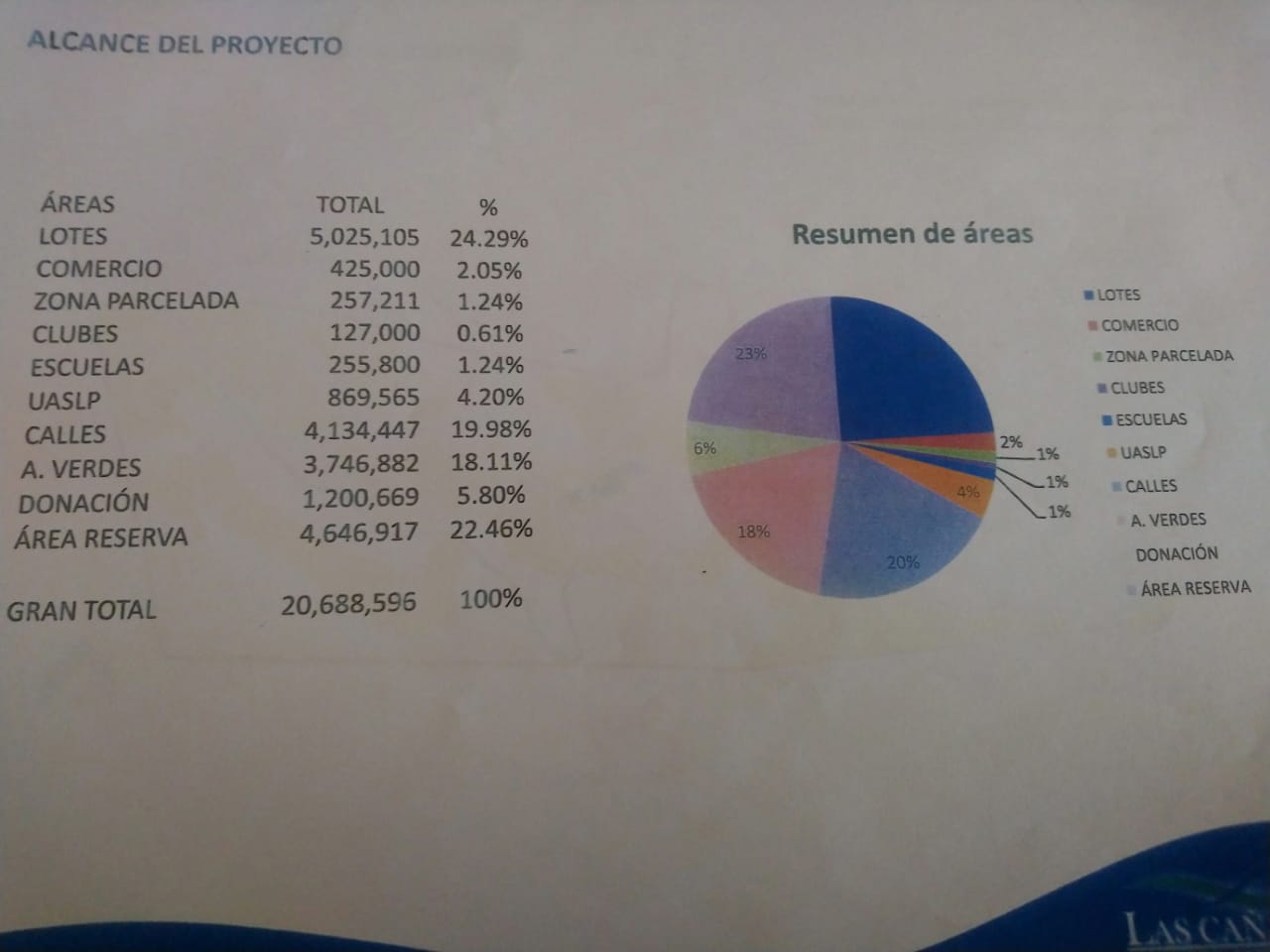 De acuerdo al proyecto inmobiliario serán 5,025, 105 M2 de lotes, 425, 000 M2 de zona Parcelada, 127,000 M2 de Clubes, 255,800 M2 de la UASLP entre otras áreas que necesitarán no menos de 30, 000 tomas de agua. Todo ello de carácter residencial.