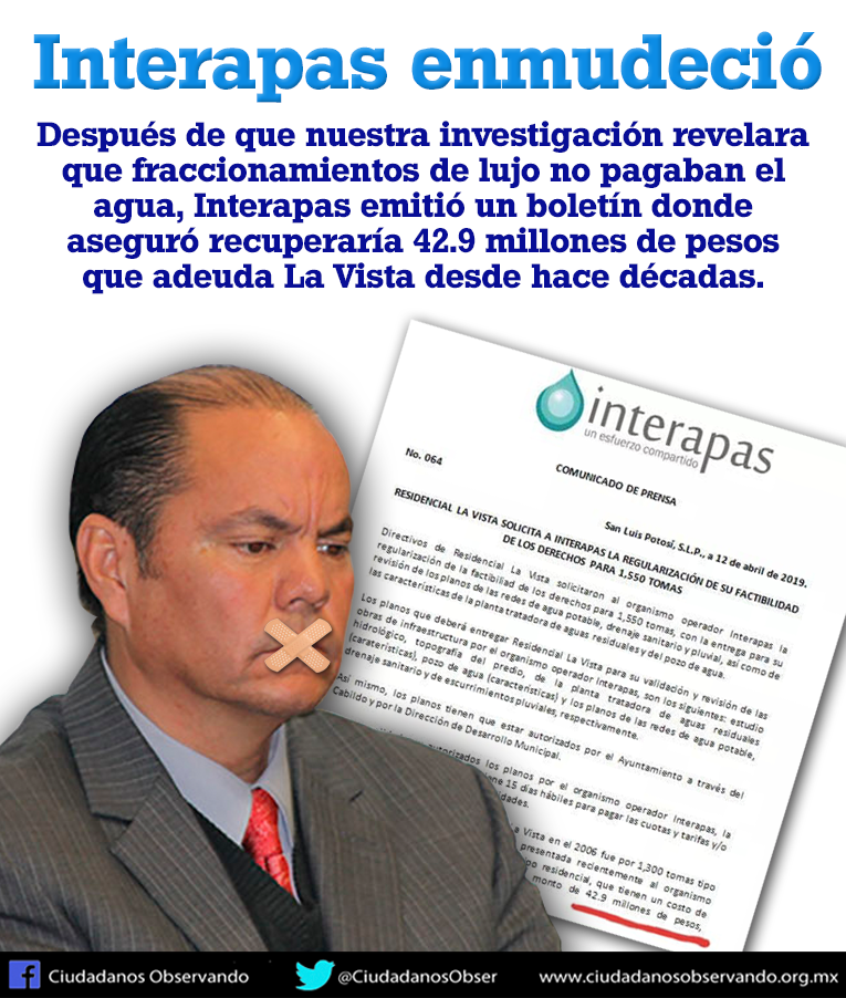 Este es sólo un caso de varios que vamos a estar denunciando de fraccionamientos que se han negado a pagar el agua mientras por otra parte existen miles de potosinos que responsablemente pagan sus recibos de agua pero obtienen un pésimo servicio o muchas veces cobros irregulares.