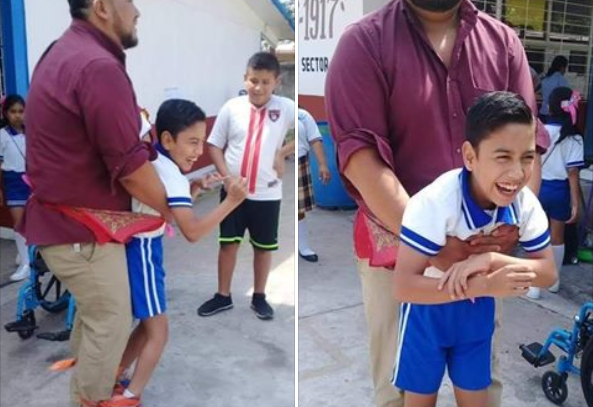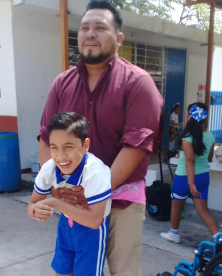 Jesús no puede sostenerse de pie o caminar, por lo que tiene que usar silla de ruedas, sin embargo los docentes de la primaría no se limitaron y plantearon esta dinámica que sin duda fueron recompensado con la hermosa sonrisa de Jesús que deja ver lo feliz que estaba.