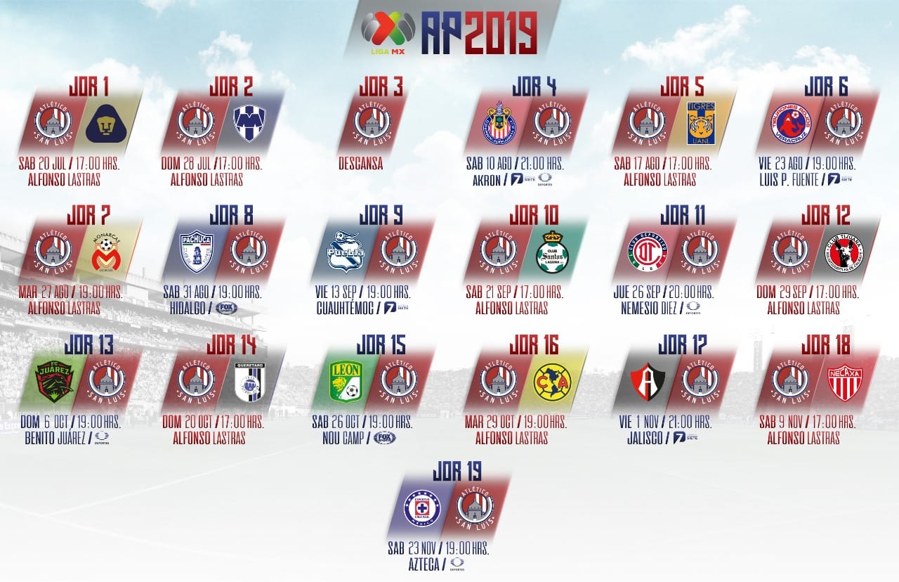 San Luis Potosí.- Ya se encuentran definidas las fechas en las que participará el Atlético San Luis dentro de la temporada de apertura de la Liga MX 2019, por lo que los fanáticos están más que ansiosos para ver al equipo de casa obtener buenos resultados.