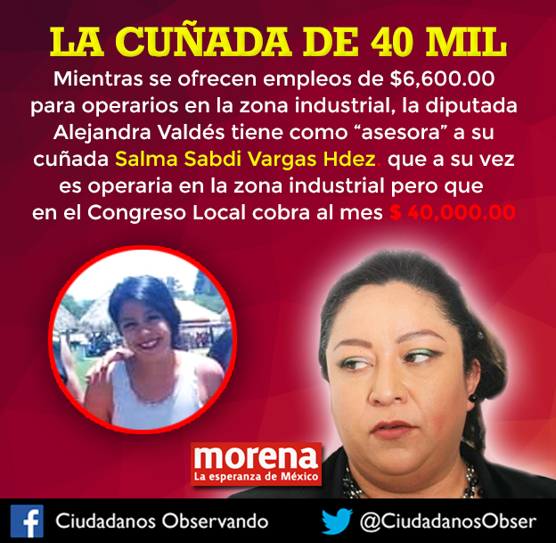 El caso de Salma Sabdi Vargas Hernández que se descubrió aparece en la nómina del Congreso del Estado de San Luis Potosí donde cobra 40 mil pesos se suma también al de la hijastra de la Diputada Alejandra Valdés Olivia Zaride Pachecho Ruíz que también aparece con un sueldo de 40 pesos. En una ridícula justificación de la legisladora mencionó “no son mis parientes porque no aparecen en mi acta de nacimiento”. La cuñada y la hija de su actual pareja por lógica no aparecen en ese documento.