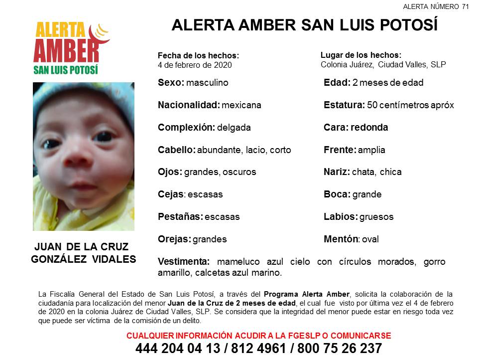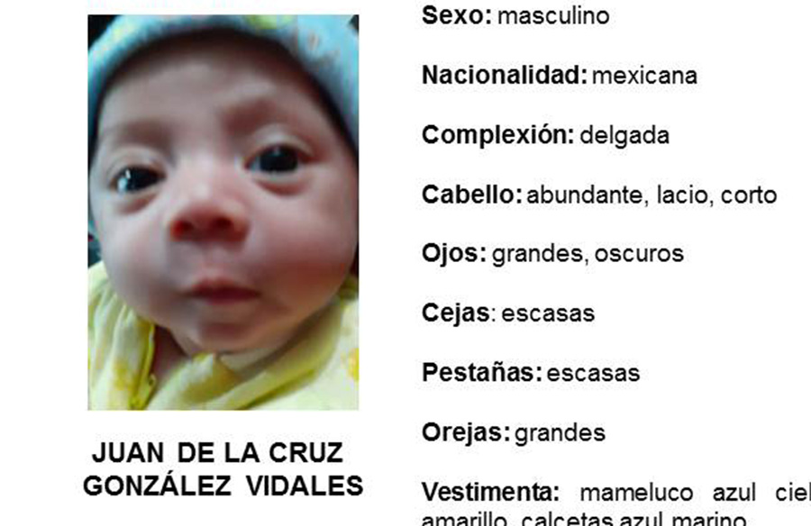 La última vez que se le vio vestía mameluco color azul cielo con bolitas moradas, gorro color amarillo de estambre y calcetas azul marino.