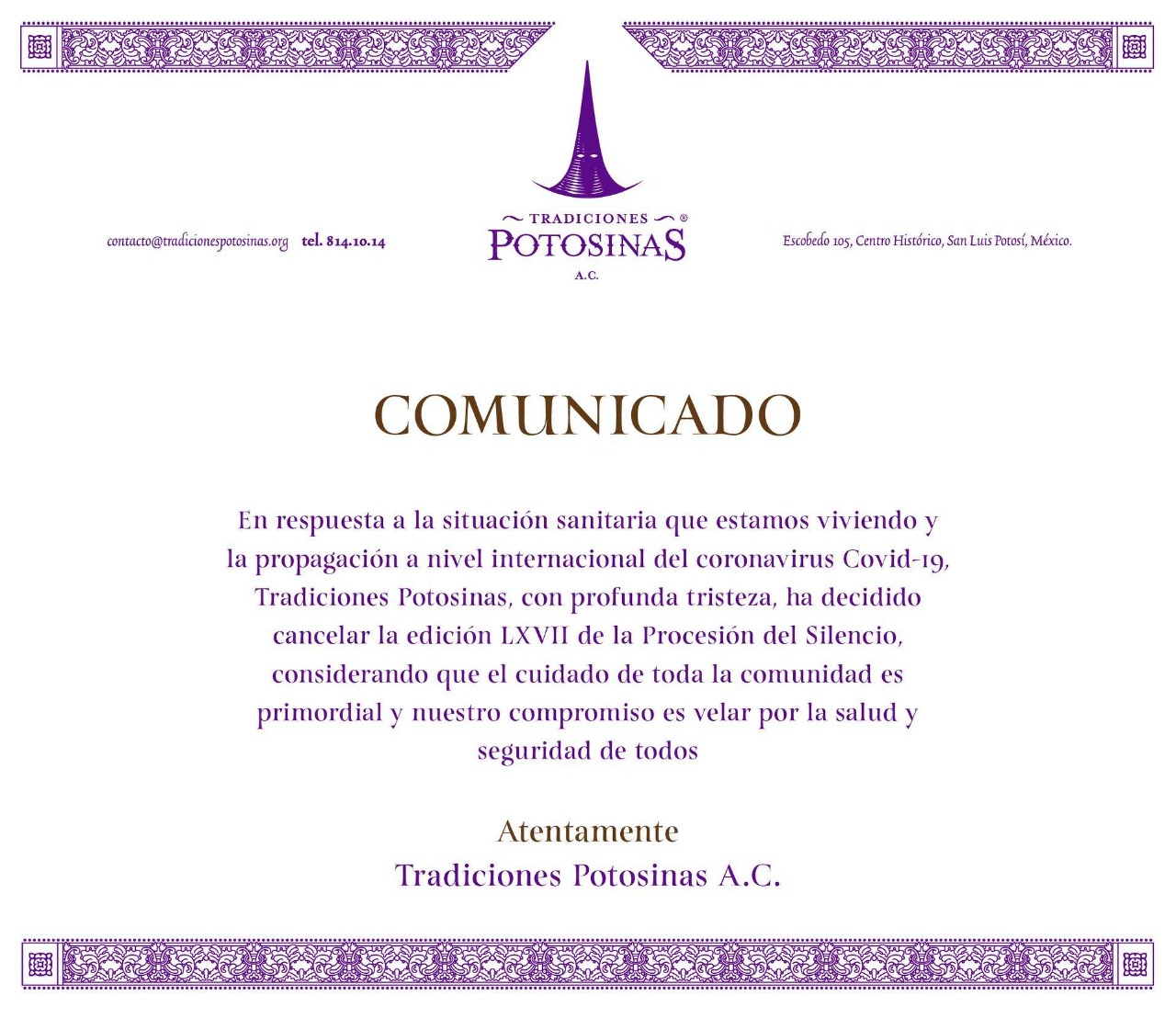 Es la primera vez en más de 67 años que la Procesión del Silencio se ve afectada a tal grado, pero las autoridades y los partícipes de este magno-evento concuerdan en que lo más prudente es llevar a cabo estas medidas sanitarias para disminuir los riesgos de contagio comunitario ante la pandemia del coronavirus COVID-19.