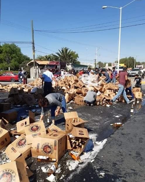 La carga de uno de los trailers que se trataba de cajas de cerveza, las cuales quedaron entre regadas en el camino y al descubierto debido a que la caja del tráiler se rompió.