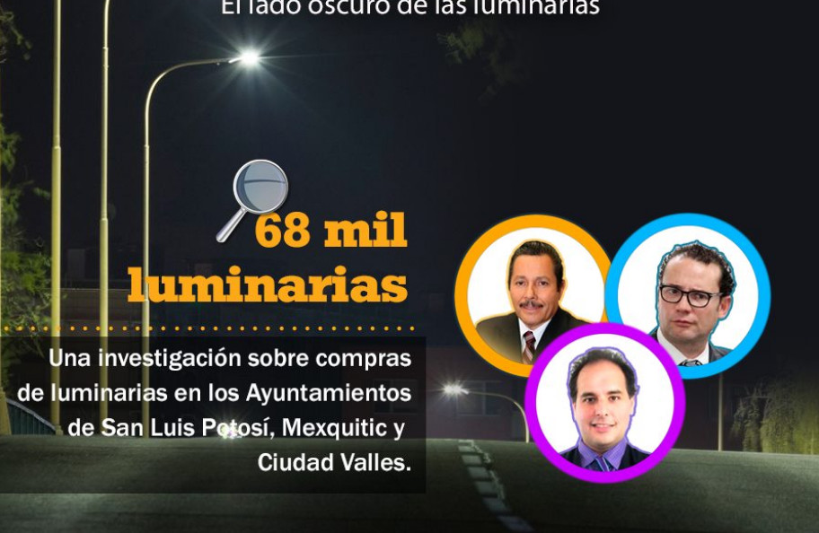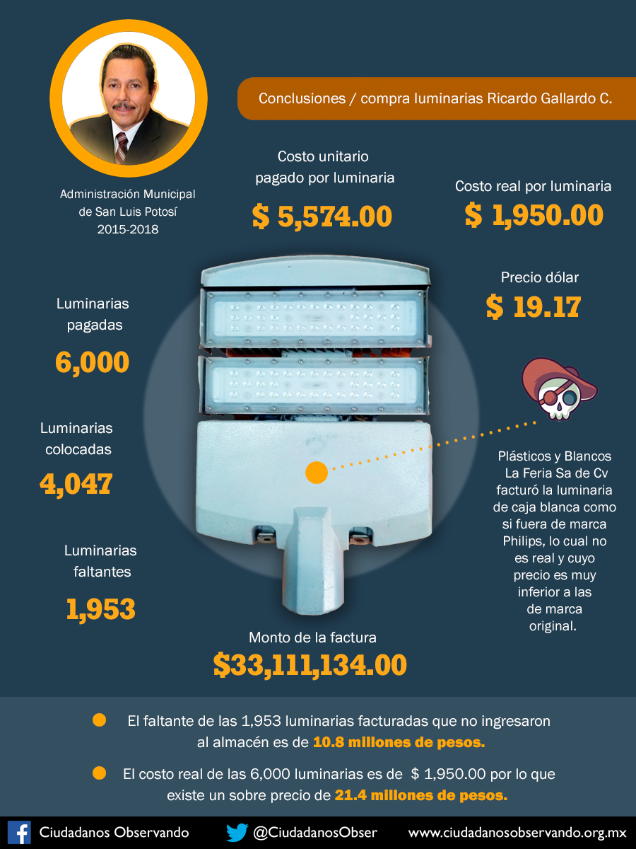 En el caso de las luminarias compradas durante la gestión de Ricardo Gallardo, destaca varias irregularidades como el sobreprecio de su compra con un excedente de 21 millones de pesos, además de un faltante de cerca de 1900 luminarias las cuales no ingresaron nunca al almacén según la investigación de la organización y que afectó al erario público por la cantidad de 10 millones.