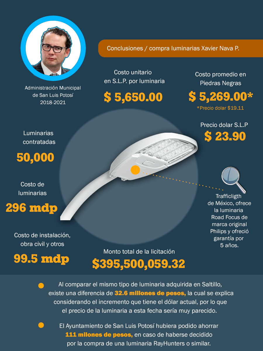 Dentro de la administración de Xavier Nava, la organización señaló que el precio parece estar en orden, pues no se muestra un excesivo sobreprecio en la compra e instalación de las luminarias. Sin embargo señaló como uno de los errores de la administración el haber comprado lámparas que alumbran menos y cuestan más, por lo que San Luis Potosí estaría perdiendo cerca de 111 millones en ahorro perdido. Puntualizando además que por alguna razón empresas que pudieran dar este ahorro no participaron en la licitación.