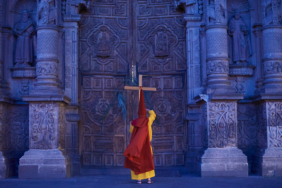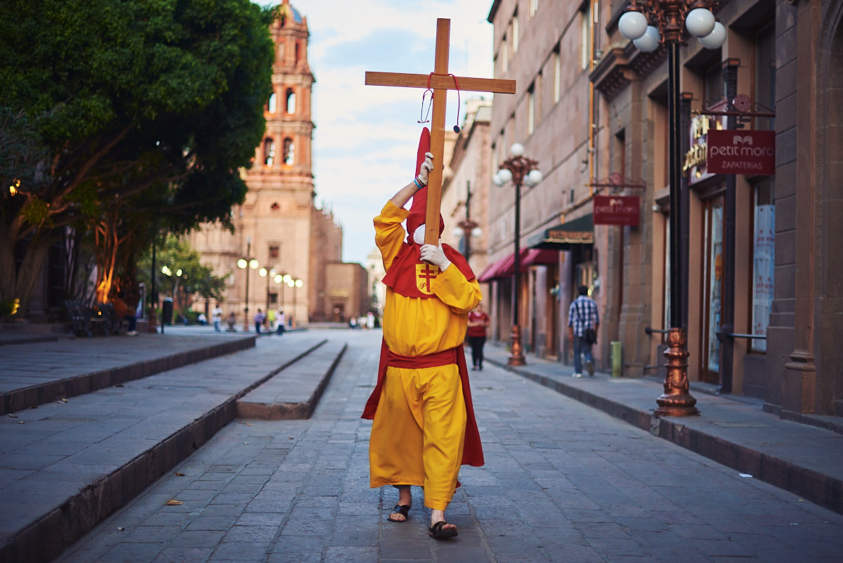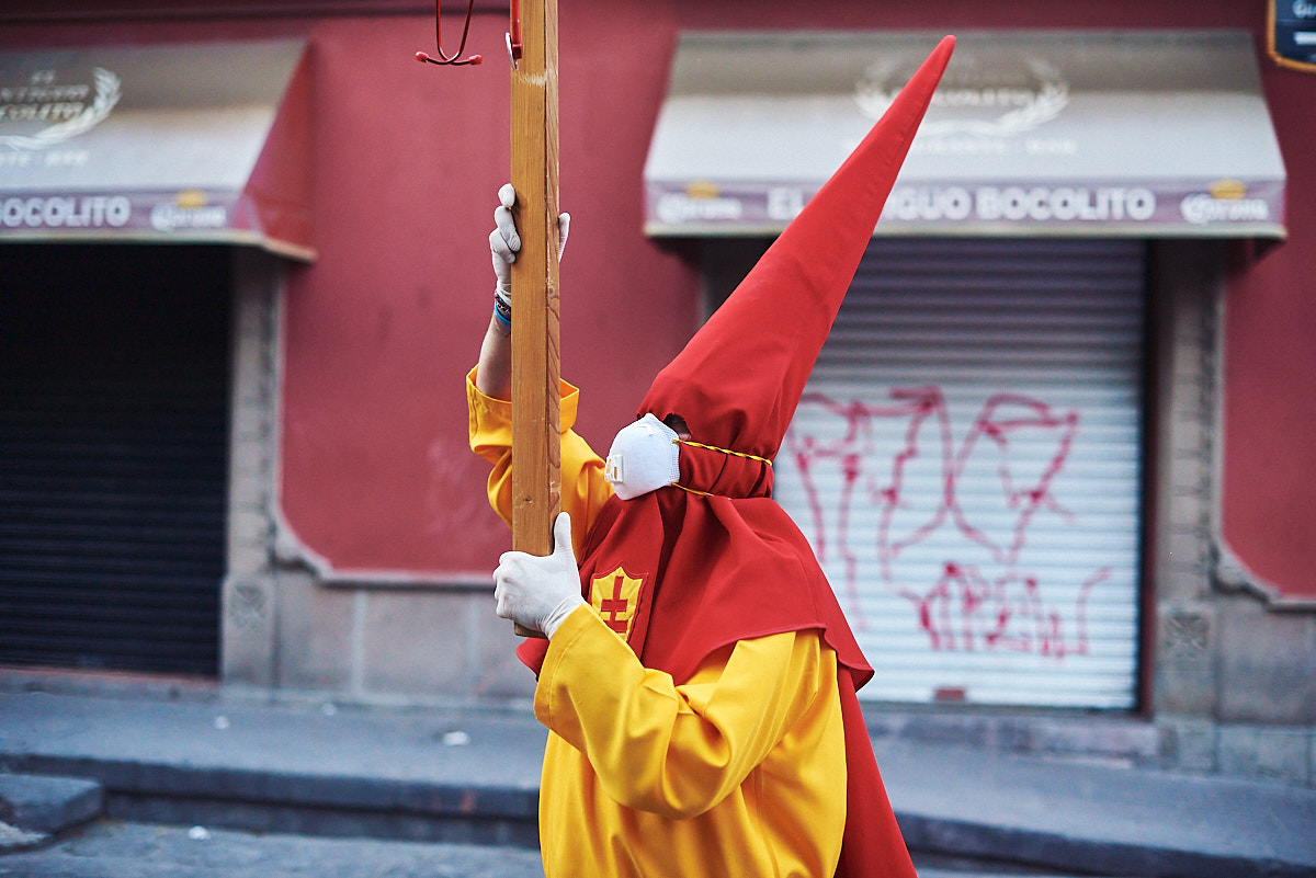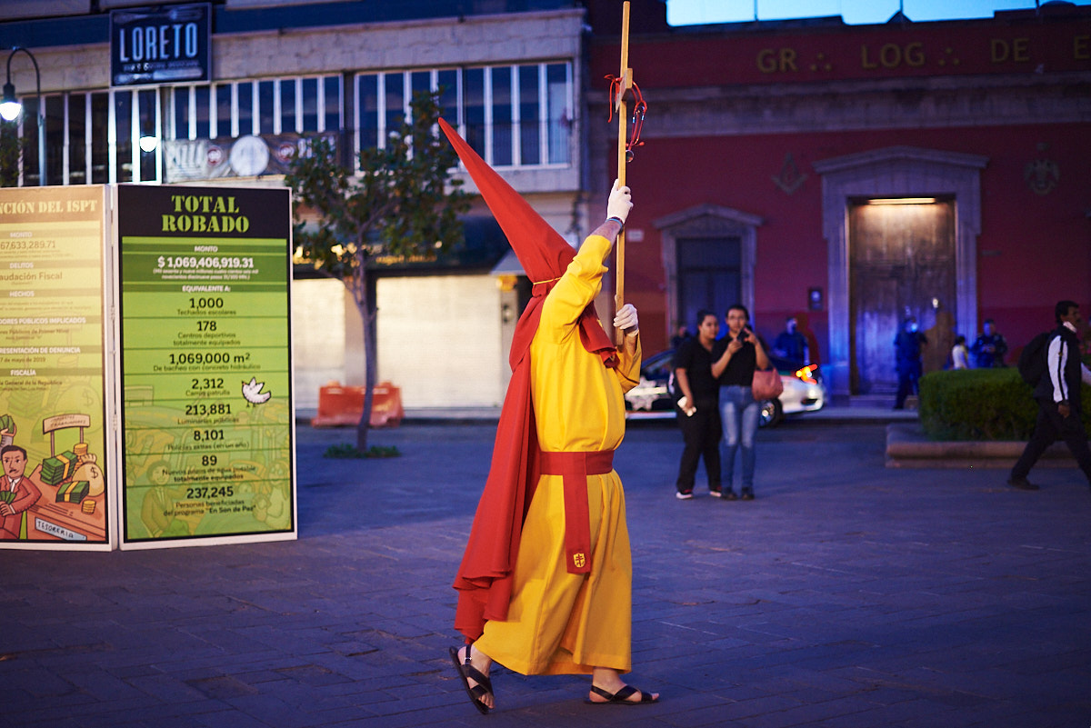 El cofrade se quedó un tiempo más, y en comparación a los otros templos, fue aquí donde más tiempo se quedó inmóvil, apenas se le podía ver con las últimas exhalaciones del día y un fuerte viento del sur era el que le daba algo de vida al agitar sus ropajes. Finalmente el cofrade terminó su oración y se marchó, como una aparición entre las sombras del frondoso árbol que está frente al Museo del Virreinato.