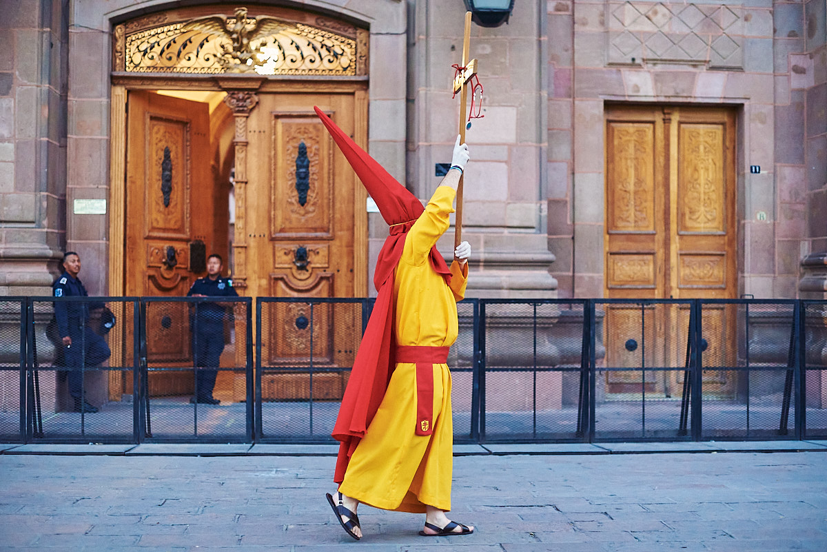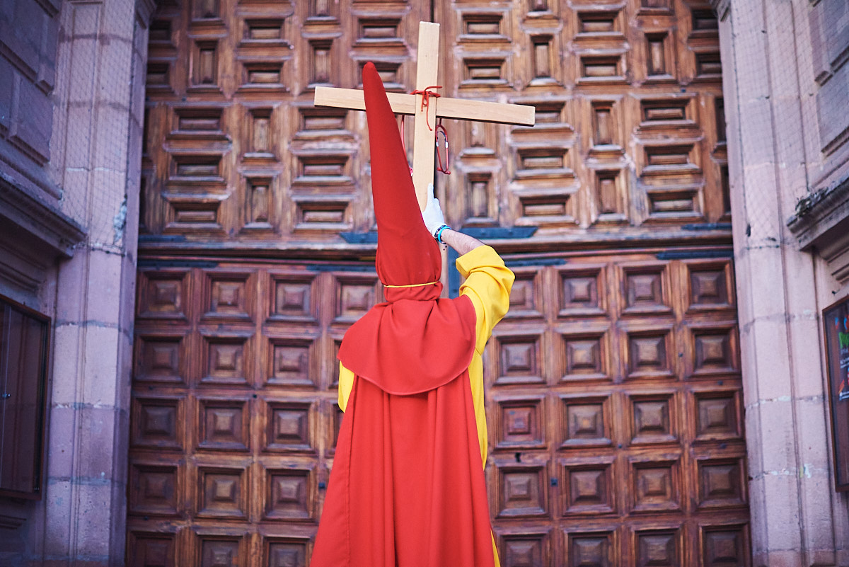 El cofrade avanzó por la parte norte de la plaza, llegando hasta la Catedral Potosina, donde nuevamente se detuvo frente a la puerta y permaneció así por varios segundos.
