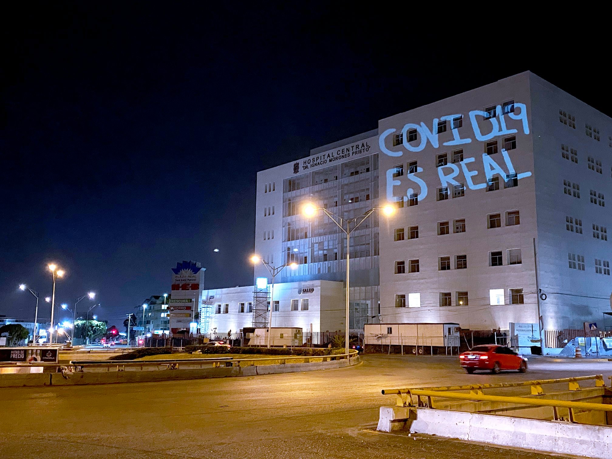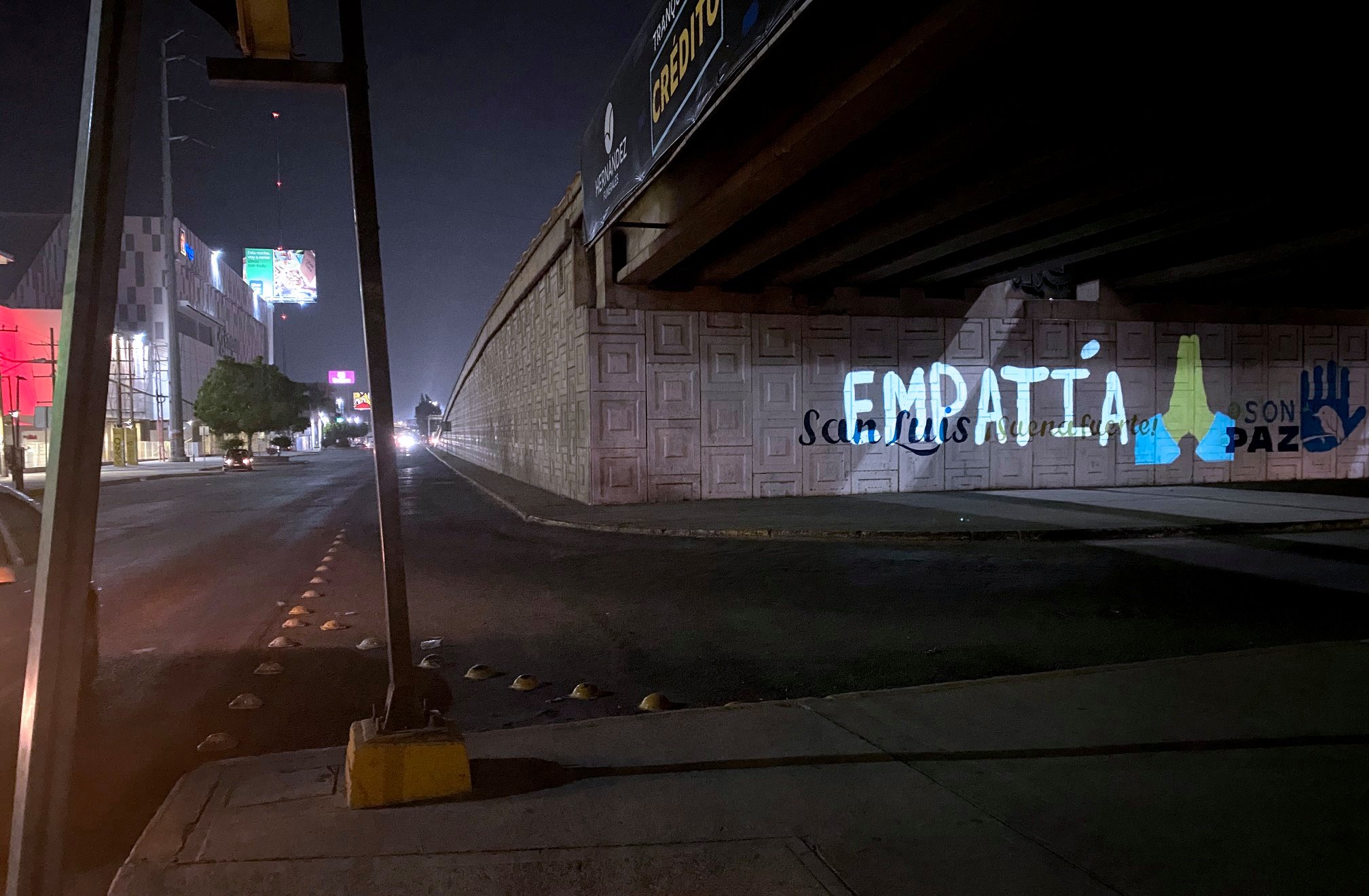 En el Hospital Central se mostraron mensajes como “Covid-19 es real” o “Cuida a tu familia” , mientras que debajo del puente de Salvador Nava entre Rutilo Torres y la Glorieta Juárez se mostraron los mensajes de “Empatía” y “Quédate en Casa”.