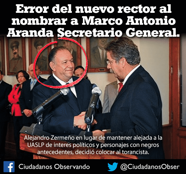 Por Ciudadanos Observando.- El nombramiento del ex magistrado, ex secretario del gobierno estatal y del ayuntamiento de la capital de San Luis Potosí, Marco Antonio Aranda Martínez como nuevo secretario general de la Universidad Autónoma de San Luis Potosí, es un error del nuevo rector Alejandro Zermeño, ya que la máxima casa de estudios se había mantenido alejada de la contaminación de políticos que han hecho mucho daño a los potosinos.