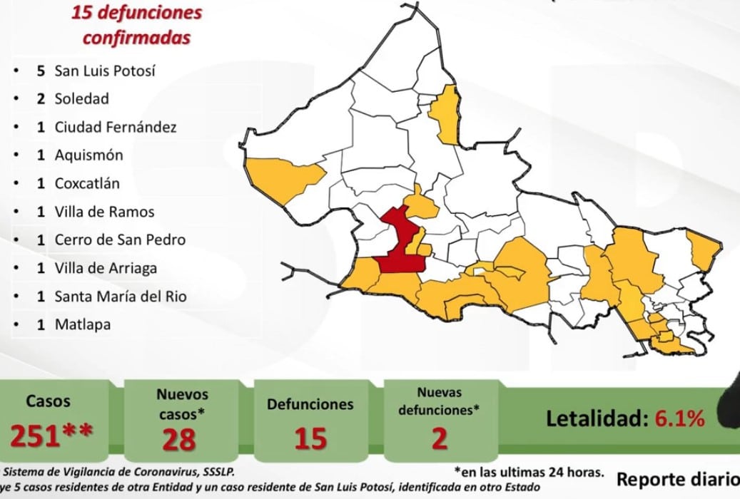 Con esto se suma un total de 251 contagios diagnosticados desde que comenzó a  presentarse el virus pandemico en el territorio potosino. Además se informó que 2 personas más fallecieron en las últimas 24 horas, sumando un total de 15 personas que han perdido la vida y estaban contagiadas de COVID-19-