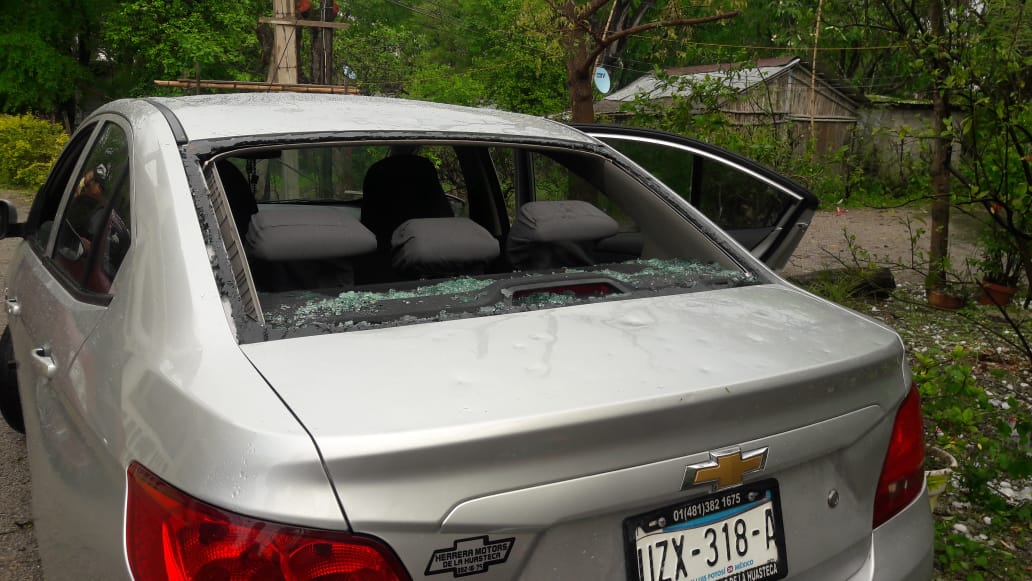 Otras imágenes muestran como las bolas de hielo lograron romper los vidrios de los autos.