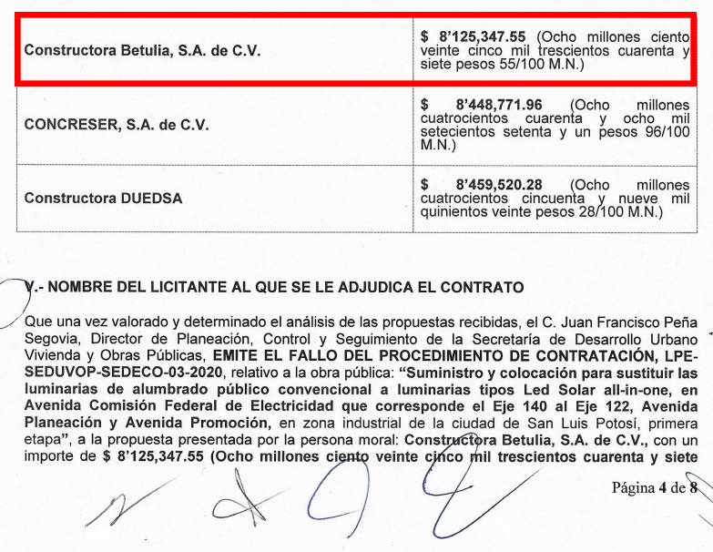 En el acta de fallo, la empresa que tuvo la oferta más barata fue «Constructora Betulia, S.A. de C.V.», cotizando $8,125,347.55, de los cuales aproximadamente el 60% está destinado a las luminarias (teniendo un costo unitario de $8,965.27) y el resto para la instalación y reparación; las dos empresas que quedaron fuera del concurso fueron «CONCRESER, S.A. de C.V.» y «Constructora DUEDSA», ofertando $8,448,771.96 y $8,459,520.28, respectivamente.