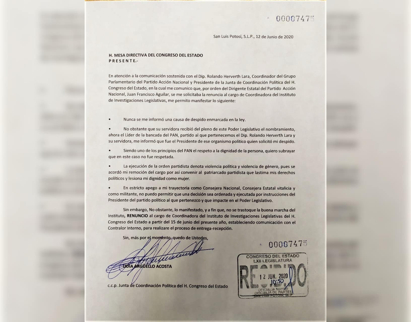 Argüello Acosta condenó que se use la dirigencia del partido para tomar decisiones que impactan al Poder Legislativo, sobre todo porque su puesto le fue otorgado por el Pleno de los diputados. Es por esto que en uno de los párrafos del documento escribió que “La ejecución de la orden partidista denota violencia política y violencia de género, pues se acordó mi remoción del cargo por así convenir al patriarcado partidista que lastima mis derechos políticos y lesiona mi dignidad como mujer”.