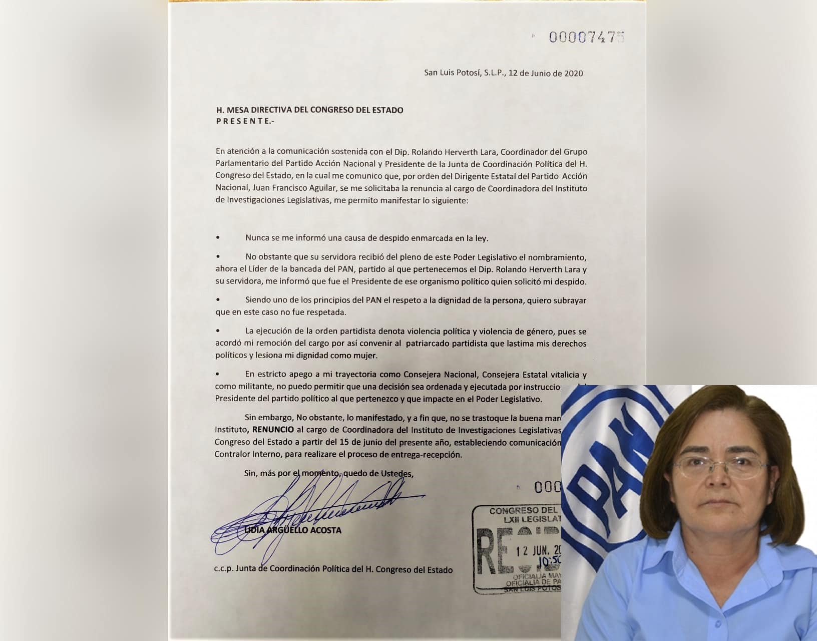 En el oficio, detalla puntualmente que Juan Francisco Aguilar Hernández (Dirigente Estatal del PAN) utilizó a Rolando Hervert Lara (diputado, coordinador del grupo parlamentario del PAN y presidente de la junta de coordinación política del Congreso del Estado) para forzarla a renunciar al cargo que sostenía como Coordinadora del Instituto de Investigaciones Legislativas.