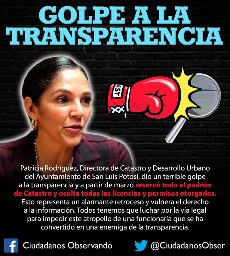 Por Ciudadanos Observando.-La directora de Catastro y Desarrollo Urbano, Patricia Rodríguez Álvarez, tomó la terrible decisión de cambiar el estatus del padrón catastral para que ahora sea considerado información reservada. Esto quiere decir que tanto la funcionaria como el Ayuntamiento capitalino pretenden ocultar toda la información relacionada con Catastro, haciendo completamente de lado las Leyes de Transparencia, lo cual simple y sencillamente se puede tomar como un retroceso de las políticas públicas municipales.