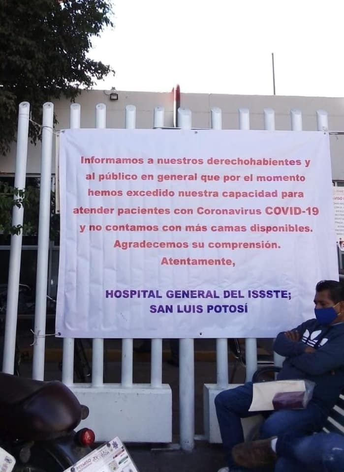 El centro médico perteneciente al Instituto de Seguridad y Servicios Sociales para los Trabajadores del Estado (ISSSTE) «Carlos Diez Gutiérrez» anunció, por medio de una manta, que se encuentra saturada de pacientes infectados con el coronavirus COVID-19.