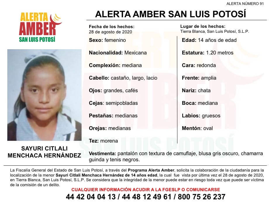 Cualquier información sobre su paradero, favor de acudir a la FGESLP, en su edificio Central de Eje Vial 100, en la zona Centro de San Luis Potosí, o comunicarse a los teléfonos 444 812 49 61 y/o al 800 7526237 lada sin costo.