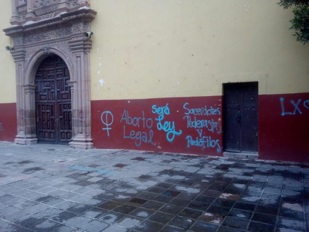 Con mensajes en pintura azul como: «Aborto Legal», «Será Ley»,«Anti Derechos» y «Sacerdotes Pederastas y Pedófilos»; fue como amaneció este templo religioso .