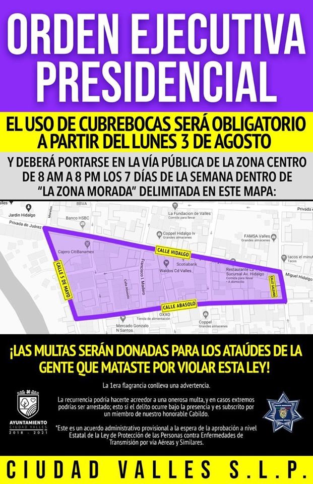El Ayuntamiento de Ciudad Valles, ha decretado bajo el amparo de la observancia de carácter general emitido desde la presidencia, la posibilidad de multar a todas aquellas personas que no utilicen un cubrebocas. Este decreto entrará en vigor a partir de este lunes 3 de agosto.