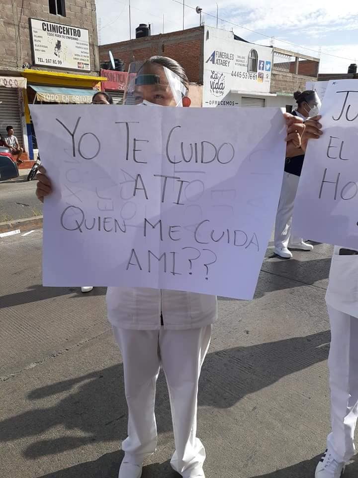 San Luis Potosí.- Esta mañana personal médico del Hospital General Soledad, el centro medular del combate contra el COVID-19 en el Estado, se manifestaron bloqueando la calle y anunciando un paro de labores simbólico para denunciar una serie de irregularidades dentro del mismo hospital.