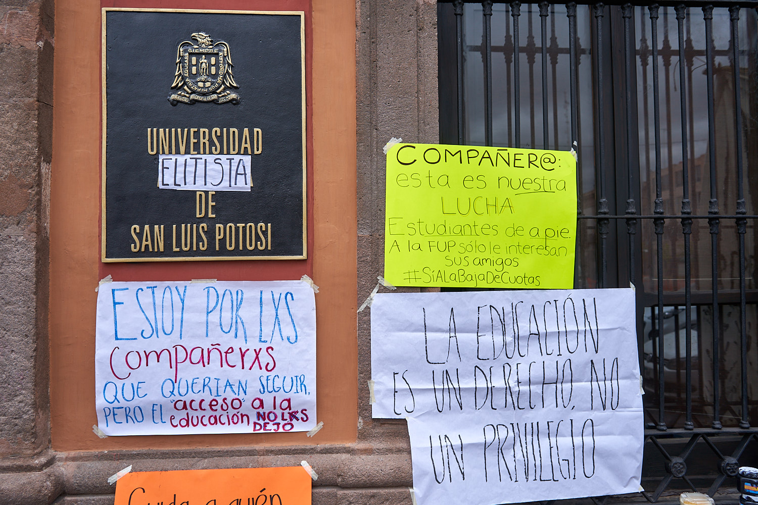 San Luis Potosí.-Un grupo jóvenes se apostaron la mañana de este jueves a las afueras del Edificio Central de la Universidad Autónoma de San Luis Potosí, con la intención de expresar su repudio por los altos costos en el costo de inscripción en las carreras de licenciatura.