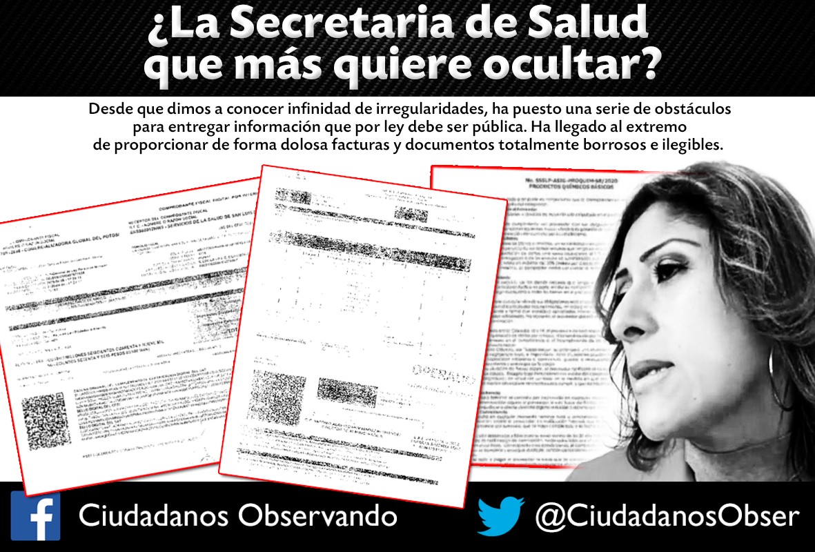 De acuerdo con Ciudadanos Observando, los Servicios de Salud del Gobierno del Estado de San Luis Potosí, que encabeza Mónica Liliana Rangel han usado una serie de artimañas y argucias burocráticas para no brindar documentos que son de carácter público pues al solicitar copias de facturas, contratos y documentos relacionados con adquisiciones y pagos a los proveedores Mauricio Ayala Gallegos, Quickshine del Potosí, EMR y VCR Operaciones, Comercializadora Global del Potosí RG, Médica Farma Arcar, Comercializadora Pentamed y de un despacho de abogados de nombre Barragán del Río y Asociados al que le pagaron 70 millones de pesos entre varios más. Después de una serie de trabas y pretextos ridículos, por fin se les dio una cita para el pasado 12 de agosto del presente año para que de forma personal señaláramos que documentos necesitábamos Tiempo después, de forma totalmente dolosa los Servicios de Salud por medio de la titular de la Unidad de Información Brenda Pérez, les hizo llegar a través de un correo electrónico los documentos que se habían solicitado pero habían sido digitalizados totalmente borrosos e ilegibles, además de mañosamente cambiar documentos por otros según explica la organización.