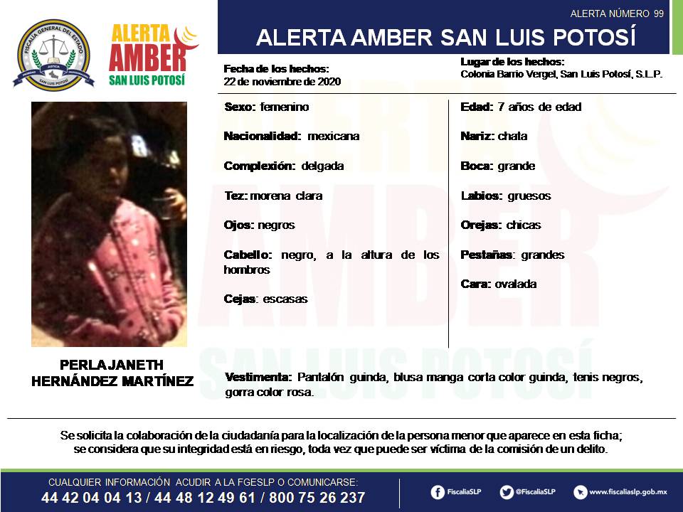 SLP- La Fiscalía General del Estado de San Luis Potosí (FGESLP), activó una Alerta Amber para localizar a una menor de 7 años de edad, de nombre Perla Janeth Hernández Martínez, quien fue vista por última vez en la colonia Barrio Vergel, perteneciente al municipio de San Luis Potosí.
