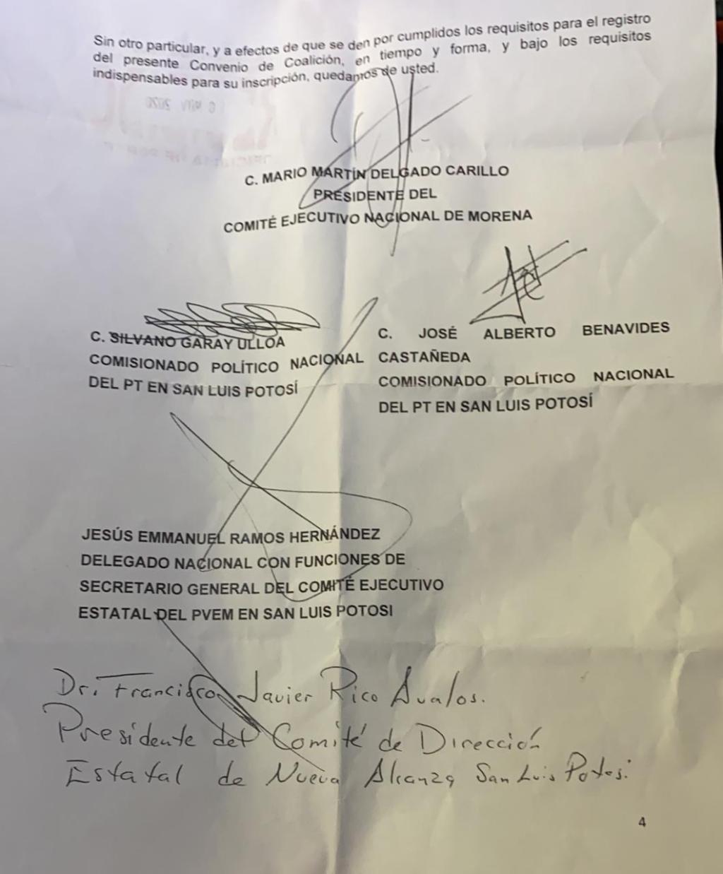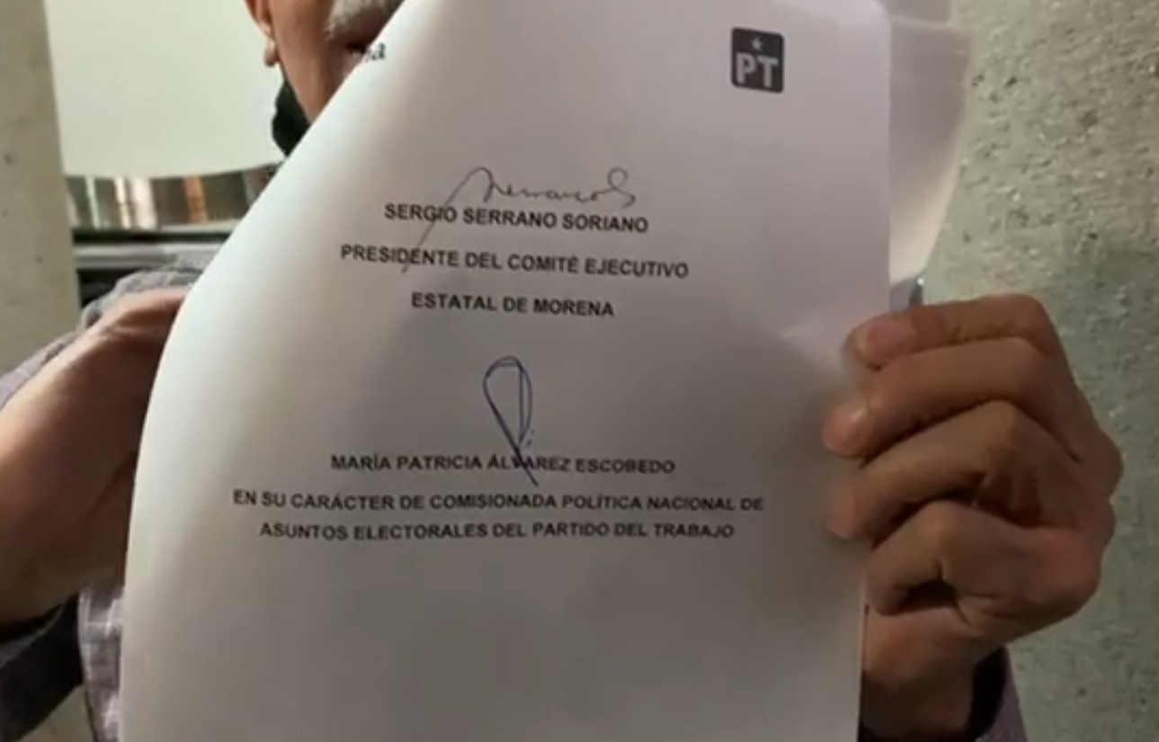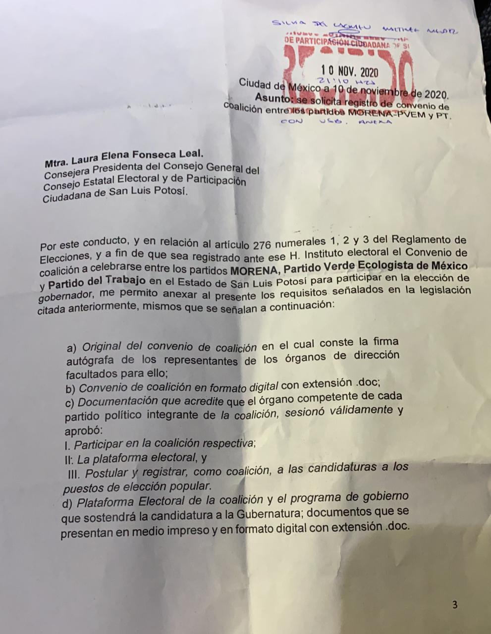 Minutos antes de las 12:00 de la noche, se haría circular en redes sociales principalmente por diputados y representantes de MORENA a nivel nacional, un documento signado por las distintas partes y con fecha de recibido el 10 de noviembre  y con hora las 21:10 hrs, en el cual se formalizaba la coalición MORENA, Partido Verde y PT.