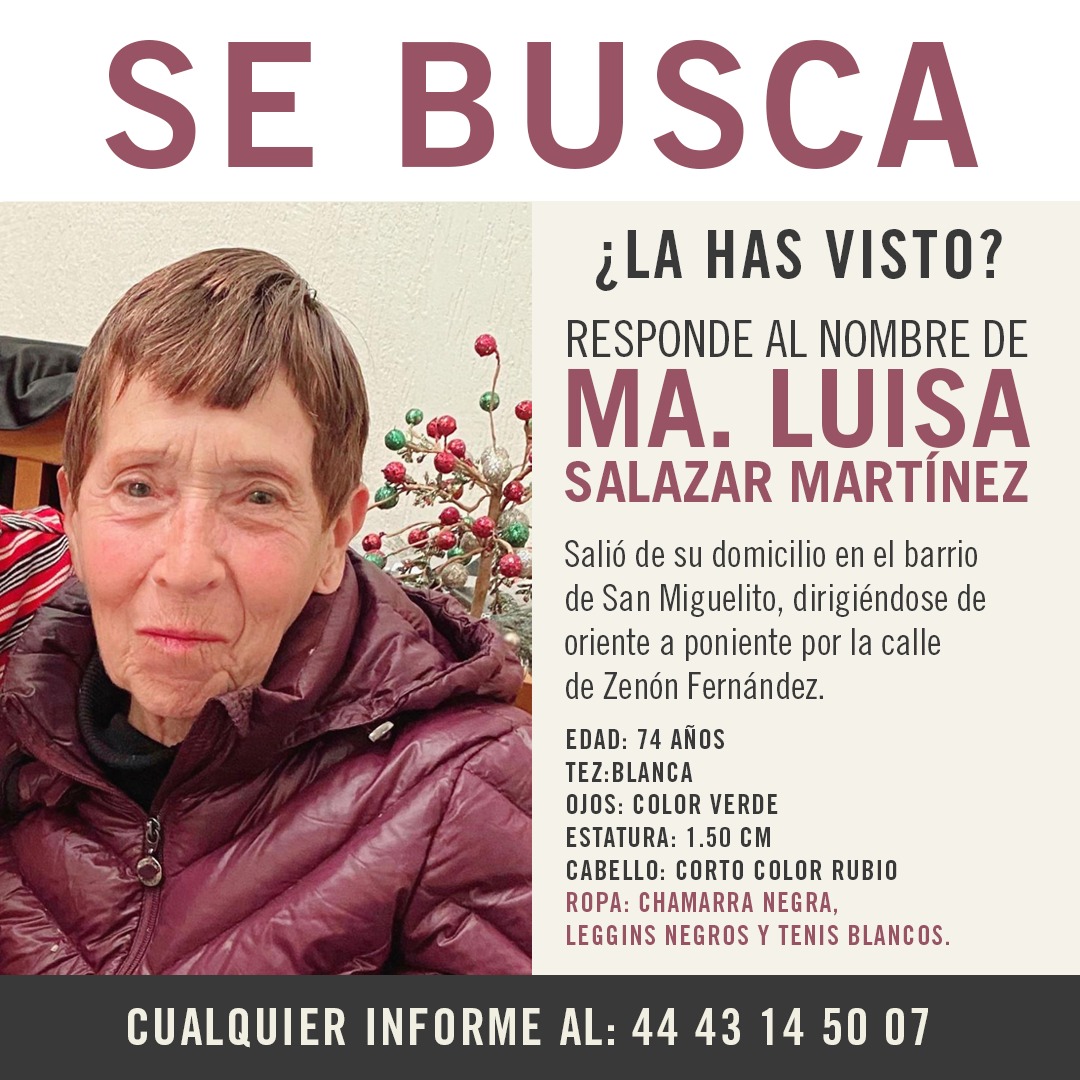 Fue vista por última vez cuando salió de su domicilio en el Barrio de San Miguelito, con dirección de oriente a poniente sobre la calle de Zenón Fernández. Ma Luisa tiene 74 años de edad y vestía chamarra negra, leggins negros y tenis blancos. Como señas particulares es de tez blanca, ojos color verde, cabellos corto y una estatura de 1.50 metros.
