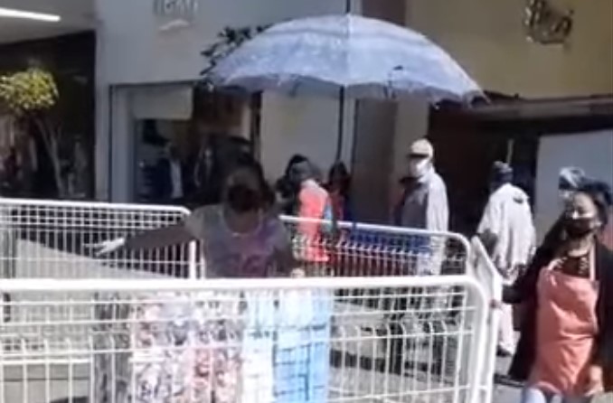 Así como lo leen, unos inspectores de comercio de la Unidad de Gestión del Centro Histórico decidieron rodear completamente a esta mujer con unas vallas metálicas, como si estuviera simulando una celda de prisión, simplemente por encontrarse vendiendo cubrebocas en la calle Miguel Hidalgo, a unos cuantos metros de la Plaza de Armas.