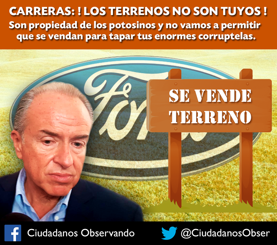 Ahora que el PRI, PAN, PRD y Conciencia Popular formarán una perversa alianza en las próximas elecciones, Juan Manuel Carreras aprovechó perfectamante esto, para “negociar” con los diputados locales de San Luis Potosí, básicamente con los panistas como Rubén Guajardo y Ricardo Villareal para que se le autorice la venta de los terrernos que se compraron para lo que sería la planta de la empresa Ford.
