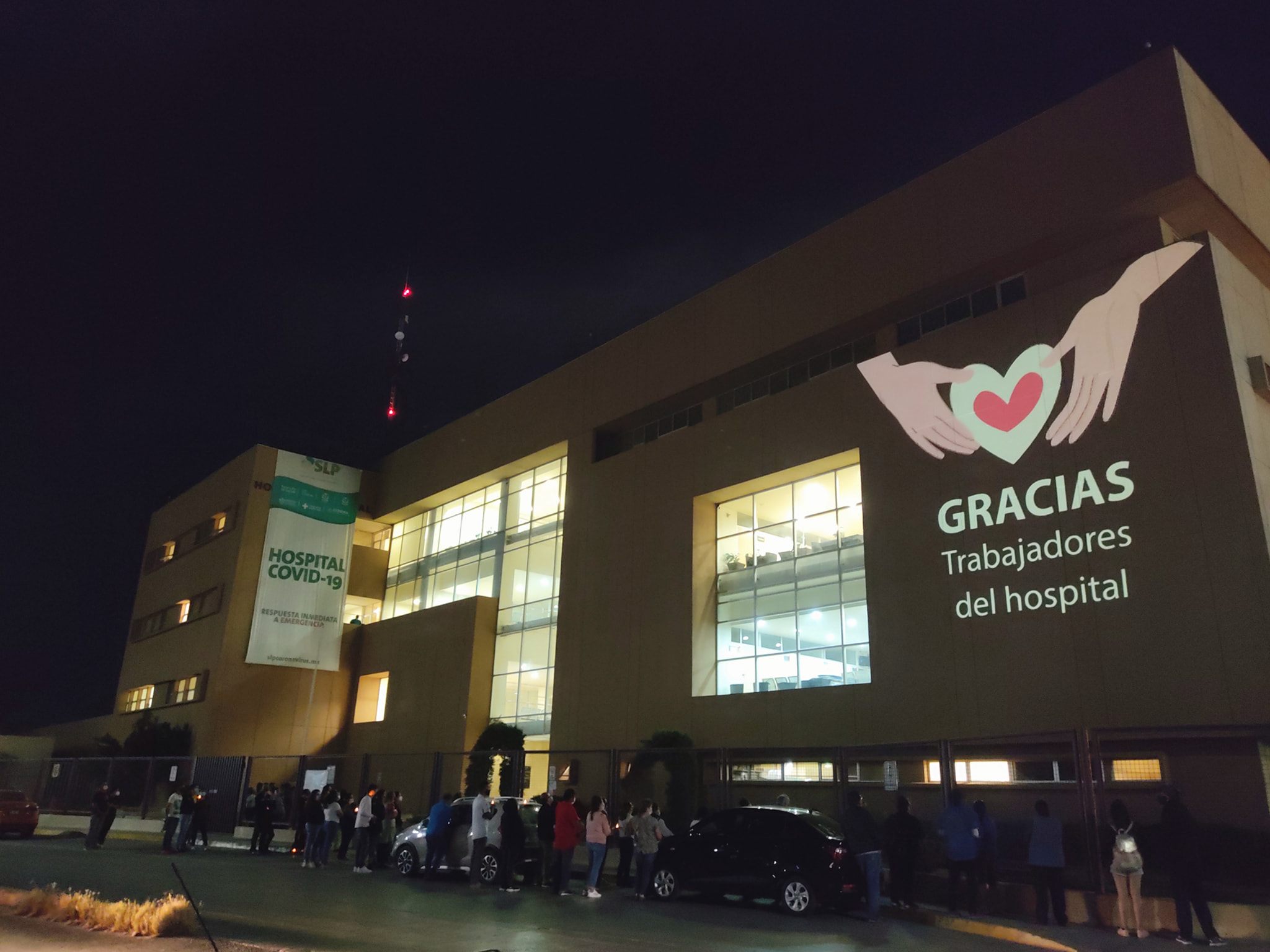 “Karina la persona que nos alentó a llevar a cabo esta misión tiene a su mamá internada desde hace aproximadamente un mes por COVID19. Como gesto de agradecimiento hacia el personal le ayudamos a proyectar mensajes de apoyo y empatía para todos los que trabajan en el Hospital de Soledad de Graciano Sánchez. Desde acá agradecemos su gran labor y vocación al arriesgar su vida por cuidar de nuestros enfermos esperando que la mami de Karina se pueda recuperar de esto para poder estar de nuevo con su familia, mucha fuerza.” publicó en su página de Facebook el colectivo.