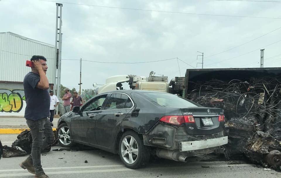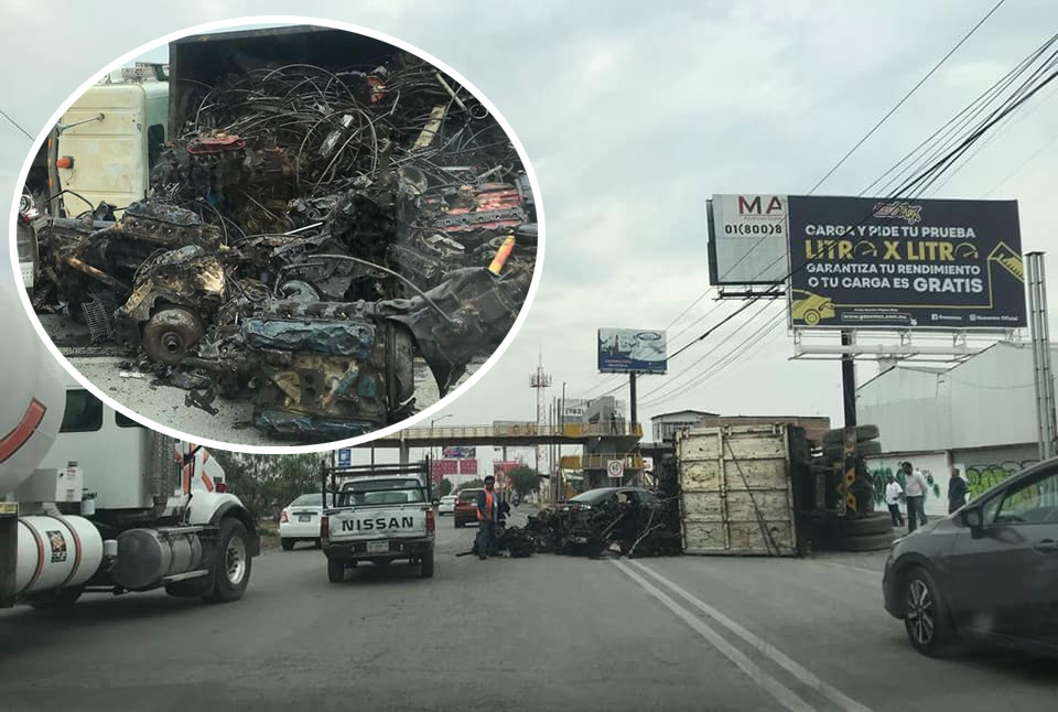 SLP.- Esta tarde un camión con una carga de chatarra, en su mayoría desechos de partes automotrices como motores, volcó sobre la carretera 57 a la altura de la colonia Las Mercedes.