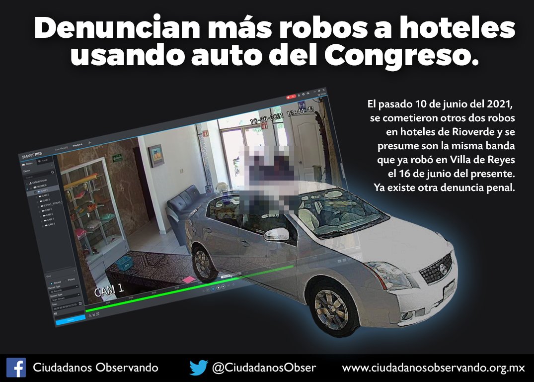 Ahora, en Rioverde los hoteles Premier y Naranjal denunciaron que el pasado 10 de junio, también fueron víctimas de robo, con el mismo modos operandi que en el robo que se cometió una semana después en Villa de Reyes. Al respecto, existen las denuncias correspondientes por los hechos, y Ciudadanos Observando cuenta con diferentes pruebas que pueden ayudar a las autoridades a dar con los responsables. Por esas pruebas, se presume que podría tratarse de las mismas personas y el mismo vehículo perteneciente al Congreso, involucrados en el robo en el hotel de Villa de Reyes.