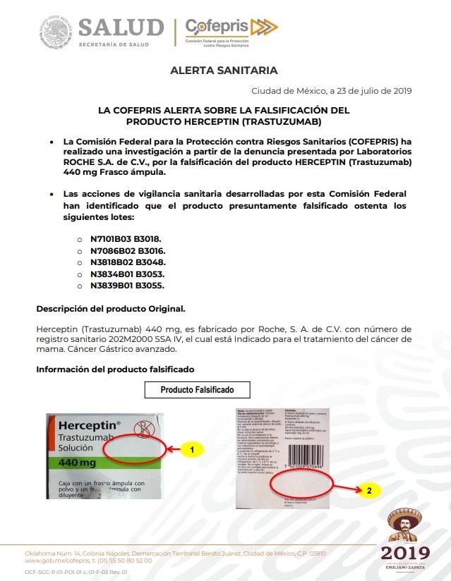 La agrupación además destacó que se sabe hasta el momento que son al menos 590 frascos con medicina falsa y que pudieron haber sido suministrados a mujeres en tratamiento de cáncer de mama entre los años 2017 y 2019 en el Hospital Central.