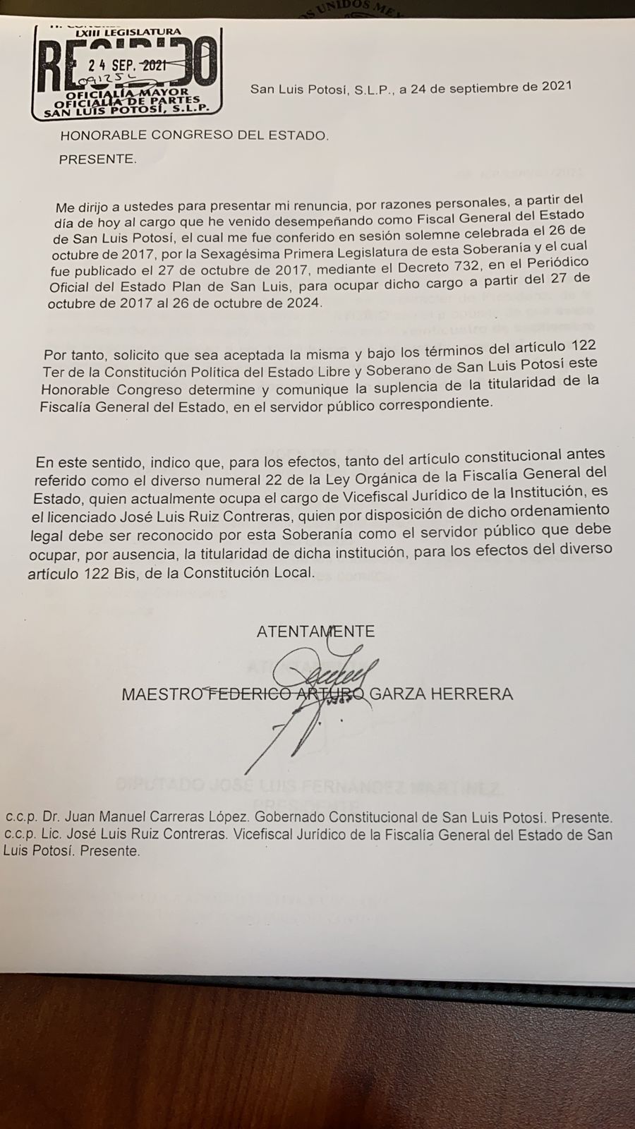 Federico Garza fue el primer fiscal del Estado desde que se conformó la institución en el año 2017 y su periodo formal concluiría en el año 2024. Se espera ahora que el Congreso del Estado espere la nueva terna propuesta por el gobierno entrante de Ricardo Gallardo para sustituir al Fiscal.