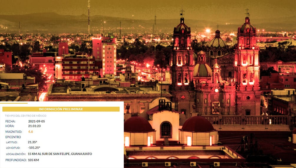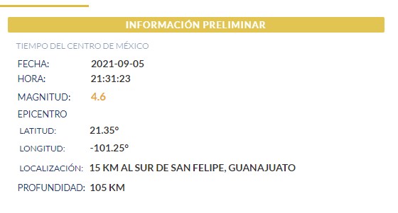 De acuerdo con el Servicio Sismológico Nacional, los aparatos de medición registraron el epicentro del sismo a 15 kilómetros al sur del municipio de San Felipe en el Estado de Guanajuato a las 21:31 horas, con una magnitud de 4.6 grados y con una profundidad de 105 kilómetros.