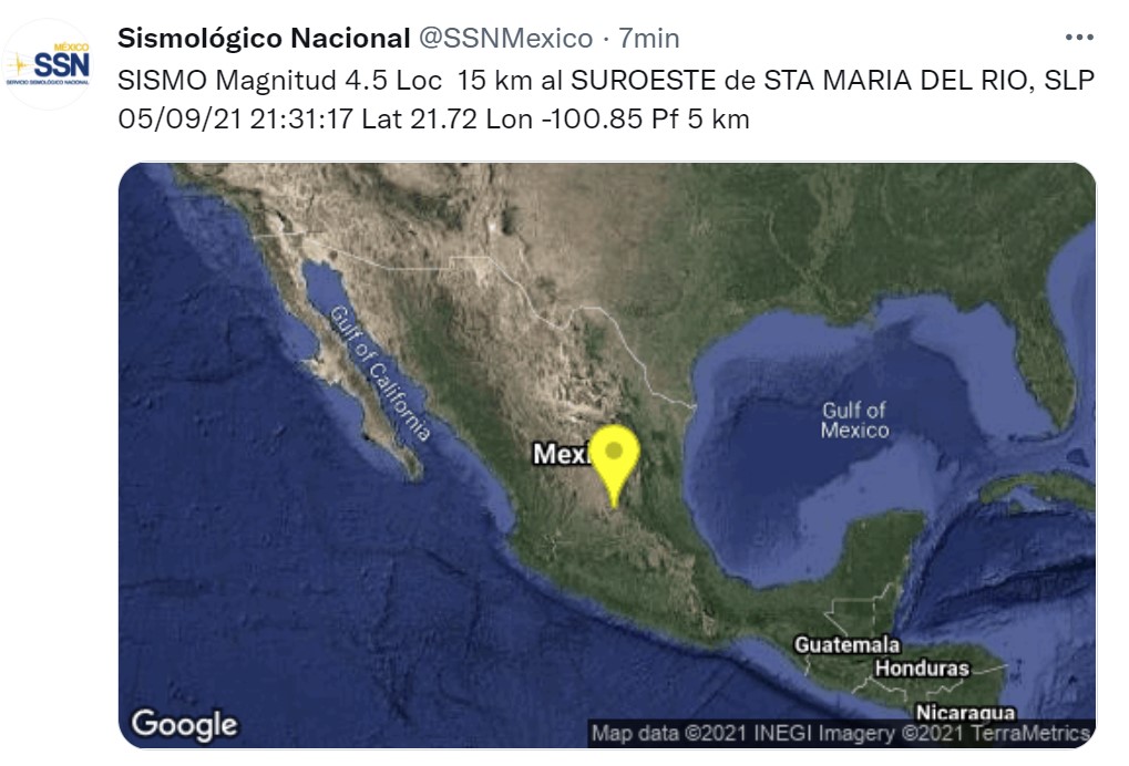 El Servicio Sismológico Nacional confirma que el sismo con magnitud de 4.5 localizado a 15 kilómetros de la cabecera municipal de Santa María del Río a 5 km de profundidad.