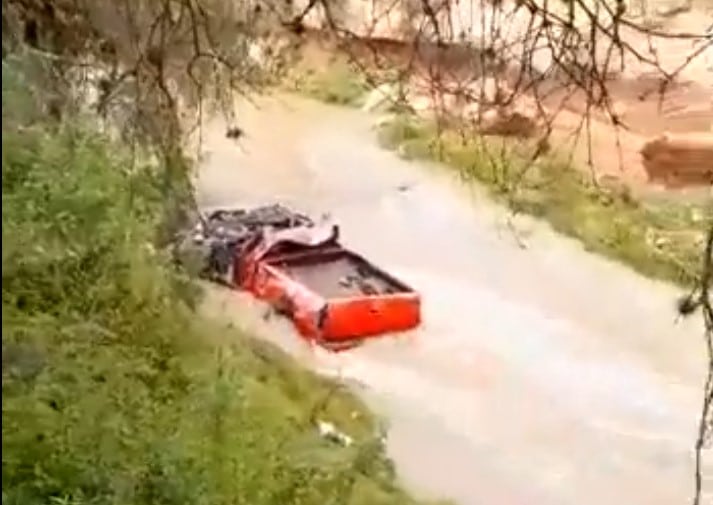 El tripulante de una camioneta color rojo de cabina, habría terminado en la corriente del río, aún no se sabe cómo llegó ahí pero se infiere que pudo haber volcado o sido arrastrado en un cruce, ya que la carrocería presenta daños.