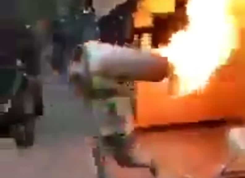 El acto quedó registrado en vídeo y se puede apreciar como el traga fuegos sale apresurado cargando el tanque a sus espaldas para posteriormente colocarlo en medio de la calle para reducir el riesgo de daños en caso de explosión.