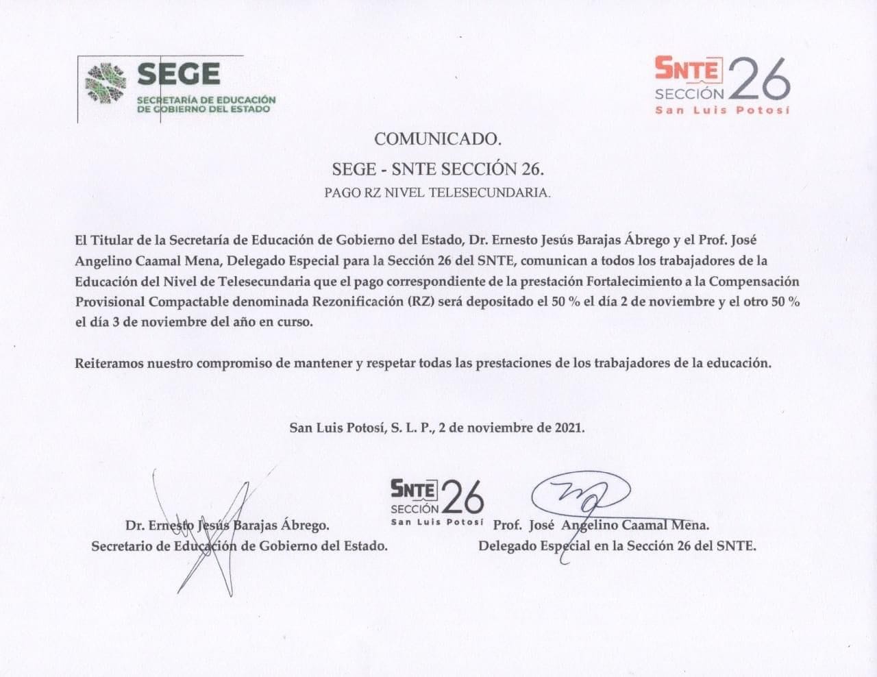 “El titular de la Secretaría de Educación de Gobierno del Estado, Dr. Ernesto Jesús Barajas Ábrego y el Prof. José Angelino Caamal Mena, Delegado Especial para la Sección 26 del SNTE, comunican a todos los trabajadores de la Educación del Nivel de Telesecundaria que el pago correspondiente de la prestación Fortalecimiento a la Compensación Provisional Compactable denominada Rezonificación (RZ) será depositada el 50% el día 2 de noviembre y el otro 50% el día 3 de noviembre del año en curso”