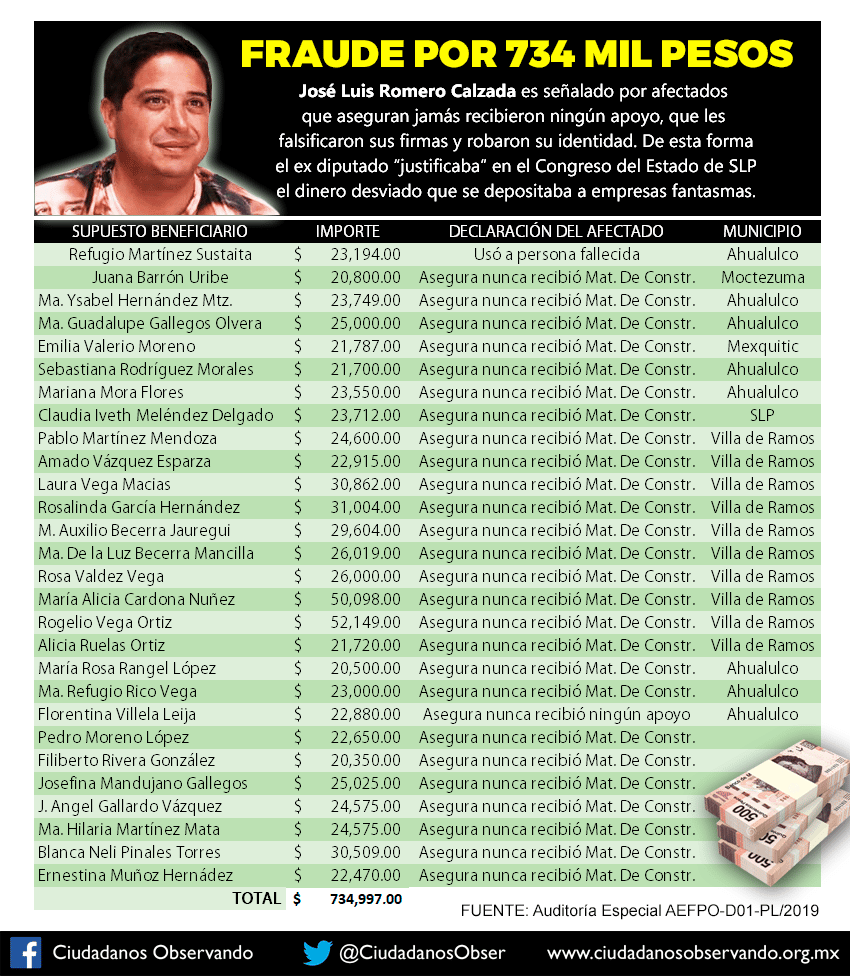 Esta información fue validada por la Auditoría Superior del Estado de San Luis Potosí en la auditoría especial número AEFPO-D01-PL/2019 producto de una denuncia realizada por varias organizaciones ciudadanas, se muestran los resultados donde isupuestos beneficiados por los ex diputados, aseguraron que jamás recibieron los mencionados apoyos y que sus firmas fueron falsificadas. Además el organismo fiscalizador comprobó el uso de empresas fantasmas y ya dio vista al SAT.